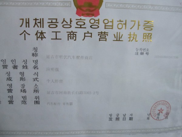 证书编号: 000002 证书名称: 个体工商户营业执照 发证机构: 延吉市工商行政管理局 生效日期: 2012年12月08日 截止日期: 2013年12月08日 认证简介: