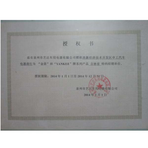 证书编号: 005 证书名称: “金迪”、“YANKEE”牌系列产品吉林省特约经销单位 发证机构: 泉州市艺达车用电器有限公司 生效日期: 2014年01月01日 截止日期: 2014年12月31日 认证简介: